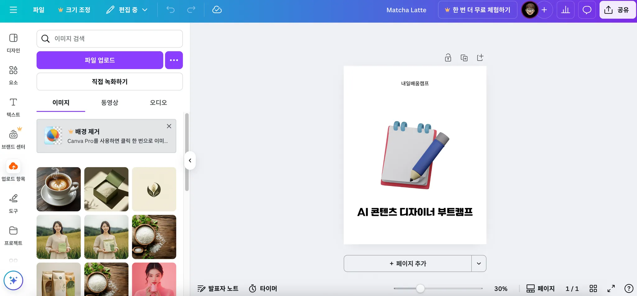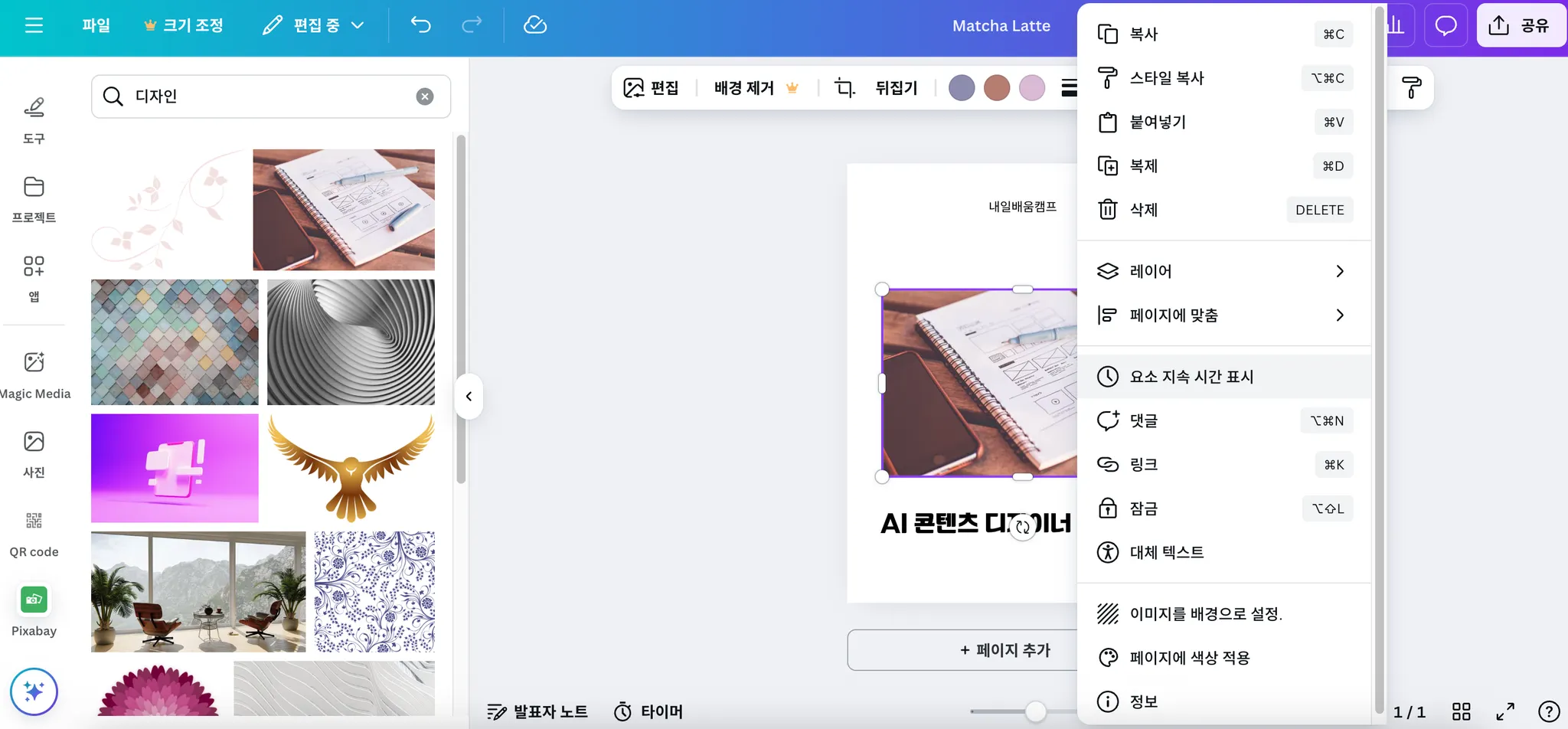 저는 디자인이라는 단어로 검색했고 해당 이미지를 클릭했더니 작업화면에 이미지가 추가된걸 볼수있어요!