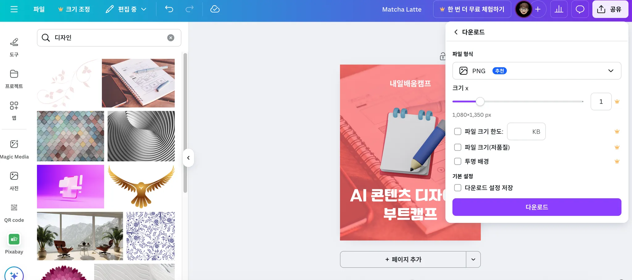 다운로드 파일형식을 뭐로할건지(보통 PNG로 하는데 조금더 고화질은 JPG로 다운로드 받으면돼요!)정하고 다음 여러 옵션들이 있는데 아쉽게 무료버젼에서는 조정할 수 없기 때문에 바로 다운로드 받으면됩니다!